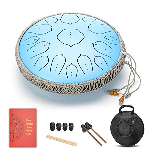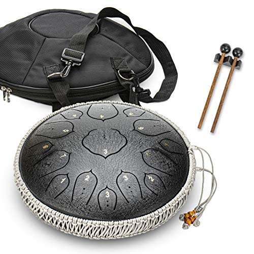 • Beautifully finished: 14" hardened steel tongue drum emits pure, soothing notes. Playing a tongue drum can relieve stress and bring relaxation and peaceful energy into your life. Perfect tuning: 15 tongues are precision cut with lasers for perfect tuning, which have a wide range of sound and can be played with mallets or with your fingers .